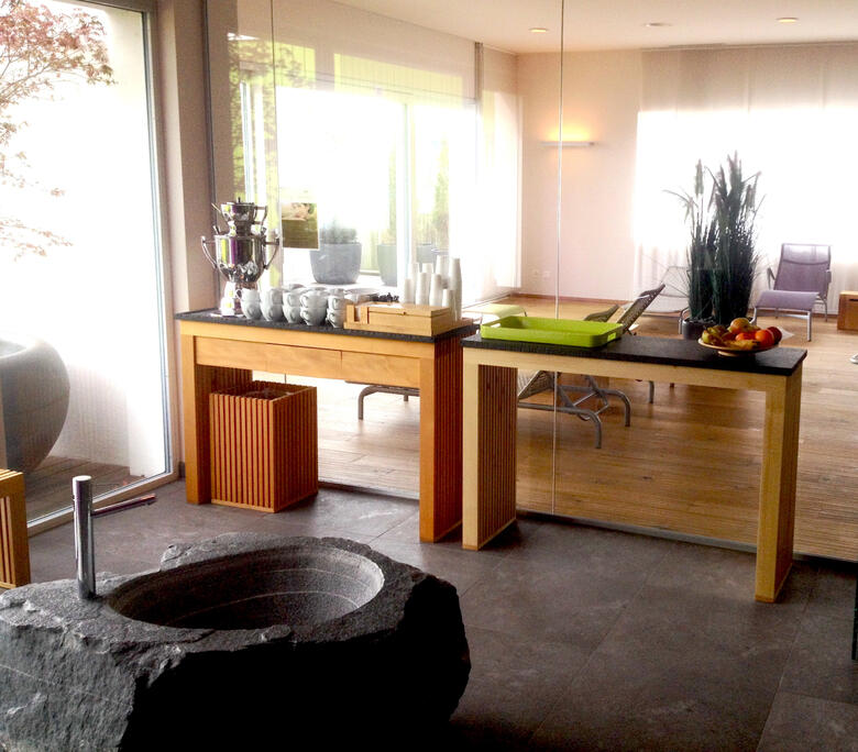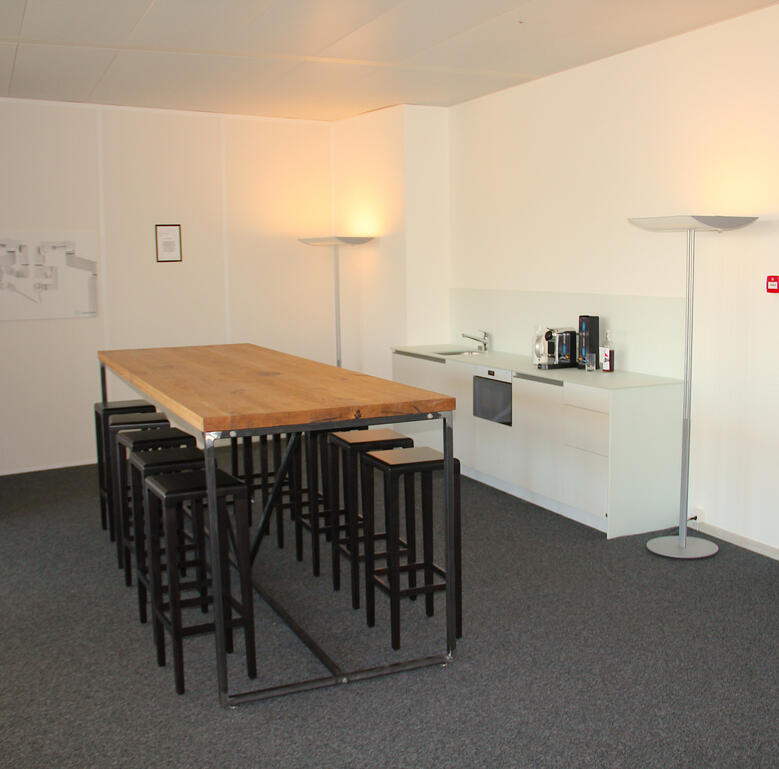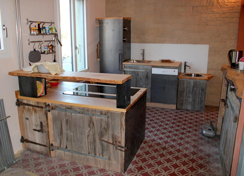 Bartisch aus massiver Eiche mit geschweisstem Unterbau und kompakter Küche.