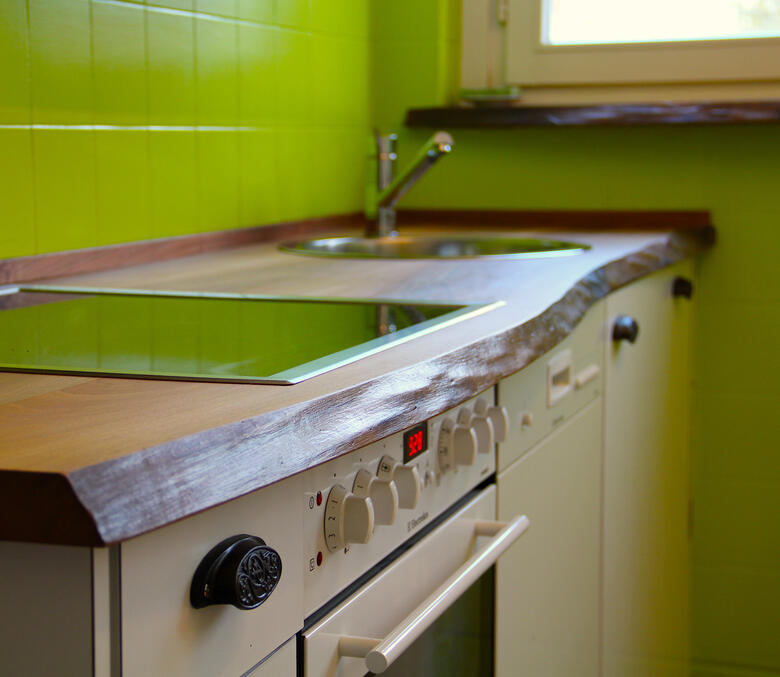 Sanfter Umbau einer Küche mit massivem Nussbaumholz mit Naturkante geölt.