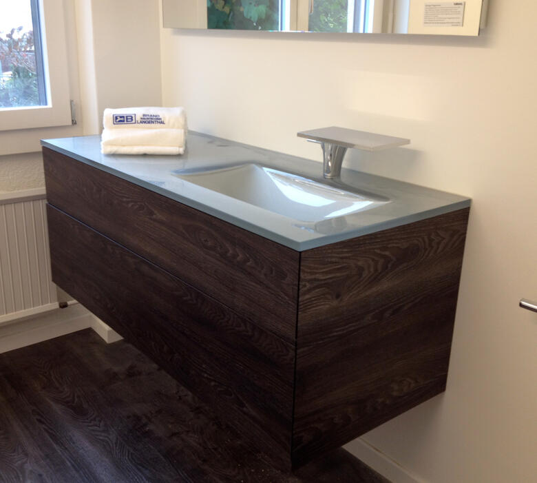 Badzimmermöbel und Boden aus dem gleichen Material.